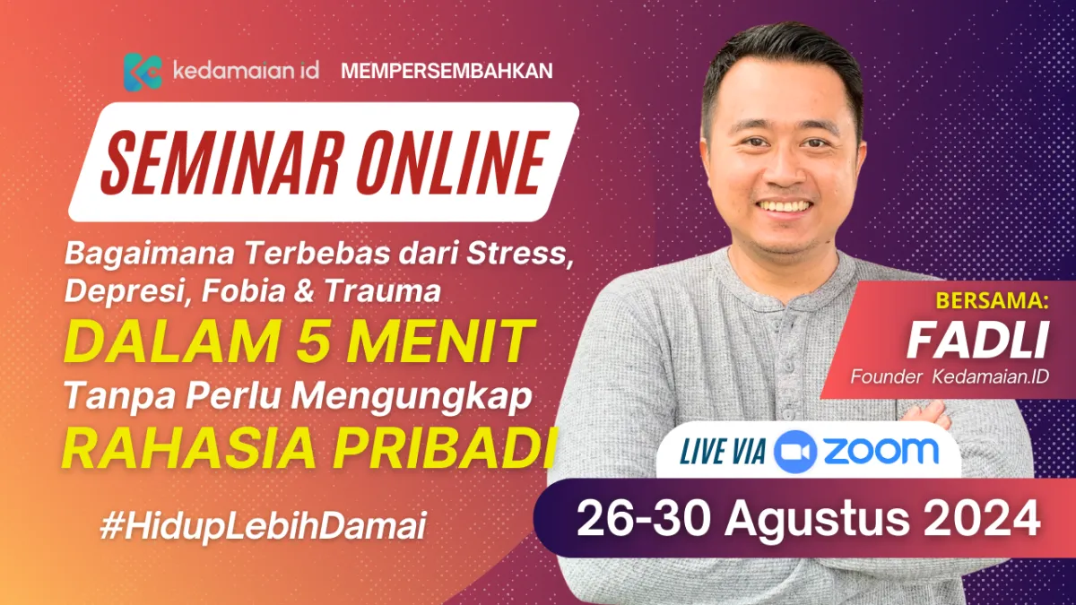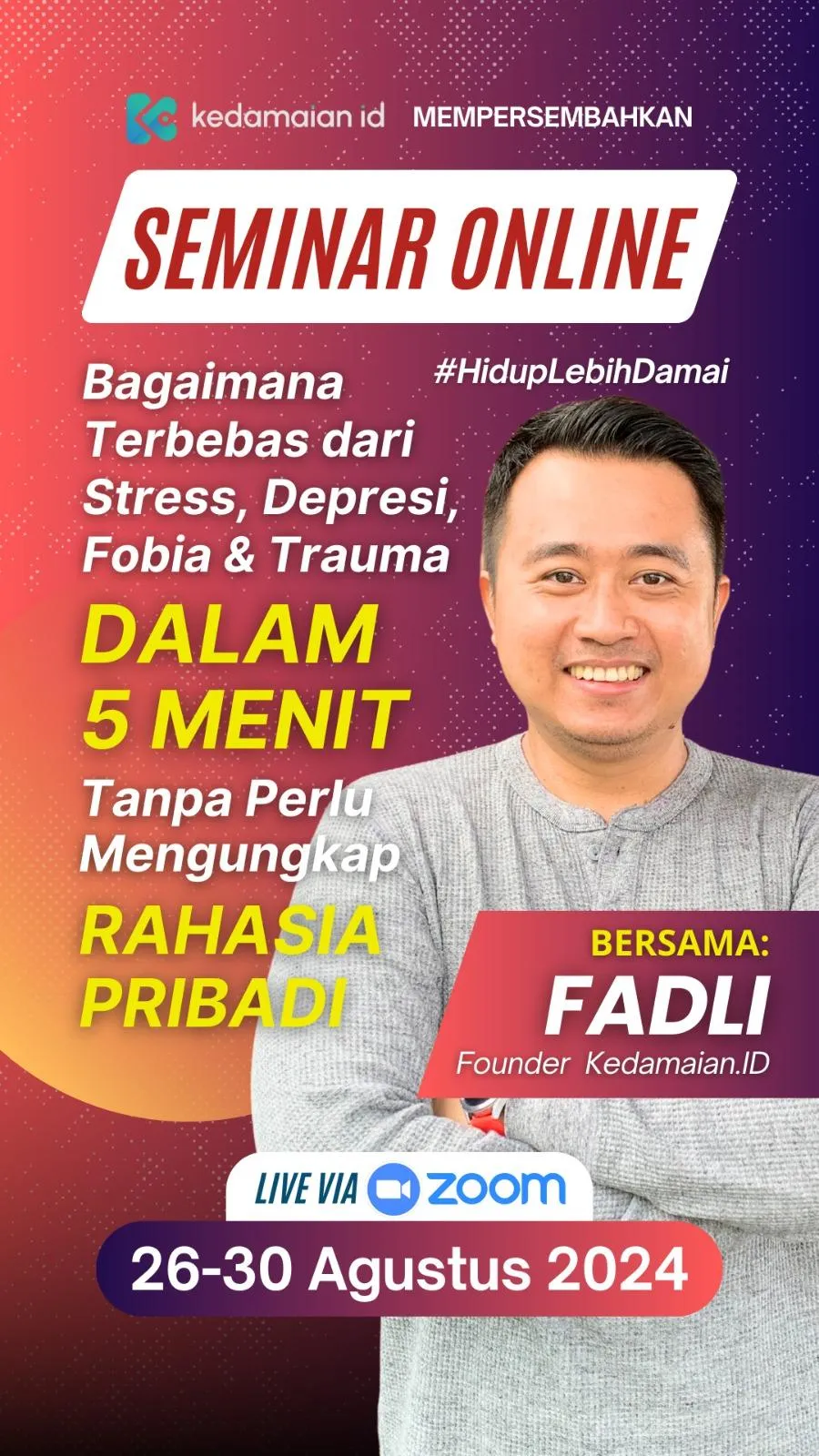 Tanggal 26 Agustus 2024 Besok saya dan Temen-temen dari Kedamaian ID membuat sebuah event yang sangat spesial, yaitu "5 HARI Bagaimana Terbebas dari Stress, Phobia, Trauma dan Depresi kurang dari 5 menit TANPA Perlu Mengungkap Rahasia Pribadi bersama FADLI"